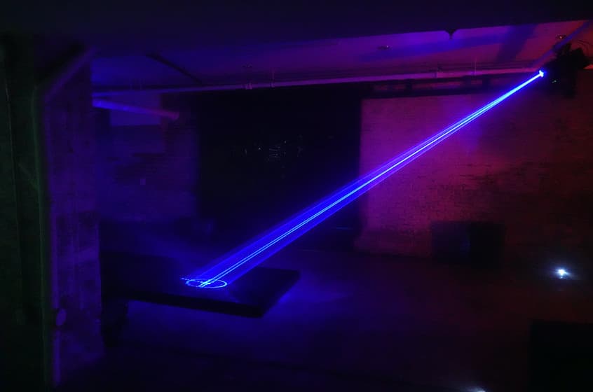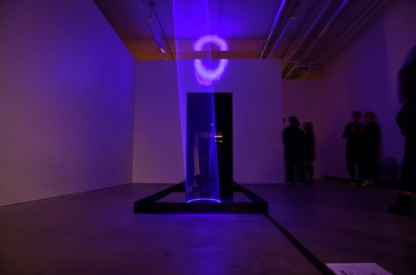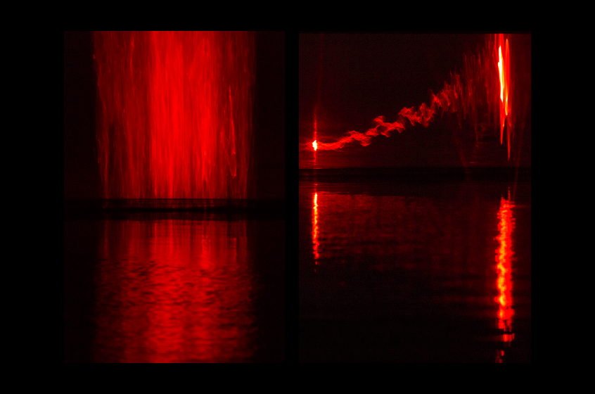 "Laser Like Water" is a digital art installation created by Baillat Studio, Jean-Sébastien Baillat, Patrick Trudeau, and Ottomata. The project was intended as a meeting of various elements that together give rise to new perceptions of those same elements only possible as a result of their amalgamation. The piece is composed of brightly-coloured lasers and shining ropes that slice through the air, fall apart upon contact with water, then are reflected and deposited onto a mirrored screen ultimately resulting in the creation of new abstract forms.