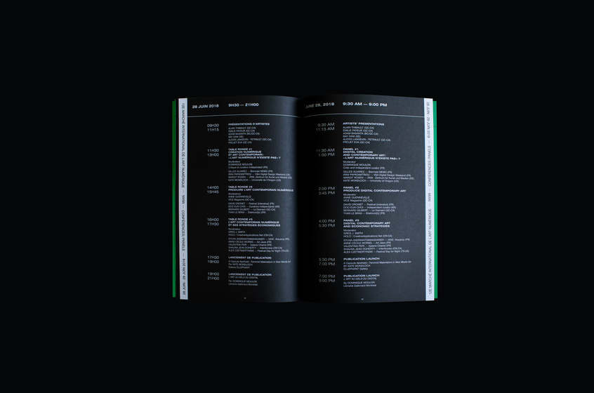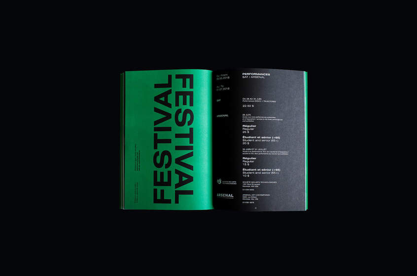 Le Studio a concentré son approche visuelle autour d’une œuvre performative, ΠTON de Codact.ch, une sorte de tube de Möbius organique, de boyau en caoutchouc réagissant aux sons. Nous avons réinterprété les images de cet invertébré électronique dans une déclinaison de situations : enfermé dans un sac plastique, perforé, modifié de texture et de couleur. L’ensemble de l’édition se distingue par sa palette de vert, noir et blanc.