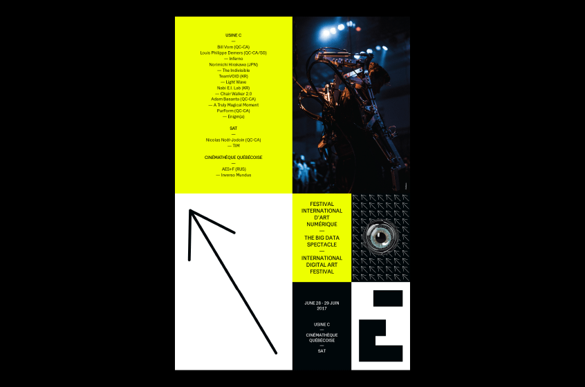 Toute la campagne 2017 a été soulignée de jaune vibrant. Les éléments graphiques pointent vers les informations sensibles et les yeux se retrouvent partout. L’information affichée, divisée et subdivisée, permet une campagne visible aux perspectives intrigantes. Un ensemble dans lequel les éléments visuels prennent autant de place que les textes.